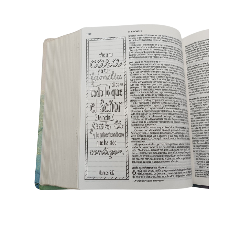 A lo largo de toda la Biblia hay ilustraciones de página completa y página parcial que dan la oportunidad de colorear versículos bíblicos para que la Biblia sea personalizada y única Cada página tiene un margen de 5 centímetros de ancho con ilustraciones de las Escrituras en blanco y negro o un espacio con renglones claros para escribir notas y reflexiones personales o dibujar y crear La Biblia Inspira tiene papel de Biblia de alta calidad con un tamaño de letra generoso de 825 que garantiza una legibilidad óptima.