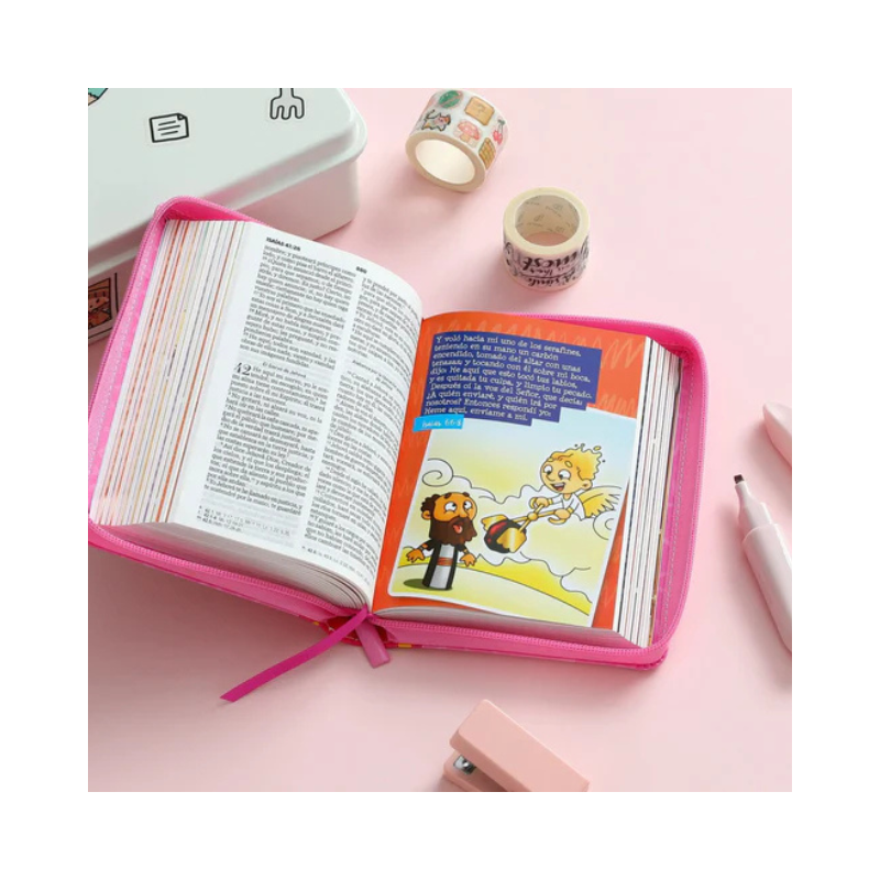 Tamaño: 13×18 Letra: 10 puntos (Tipografía mejorada para mejor legibilidad) Páginas: 1536 + 100 láminas a todo color con los populares dibujos de la Biblia para todos los niños Plan para leer la Biblia en un año Versículos para memorizar Plan de salvación para los más pequeños. Mapas Bíblicos. Página de dedicatoria Cómo leer la Biblia