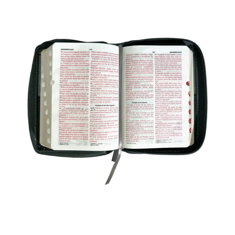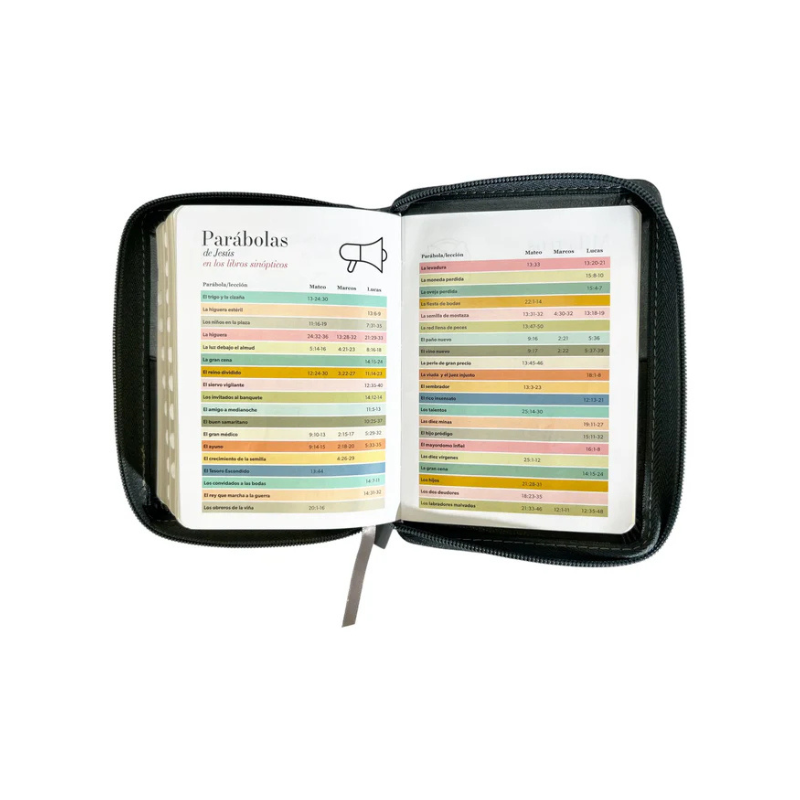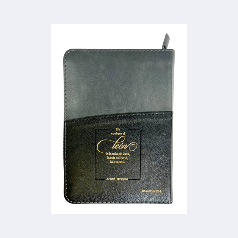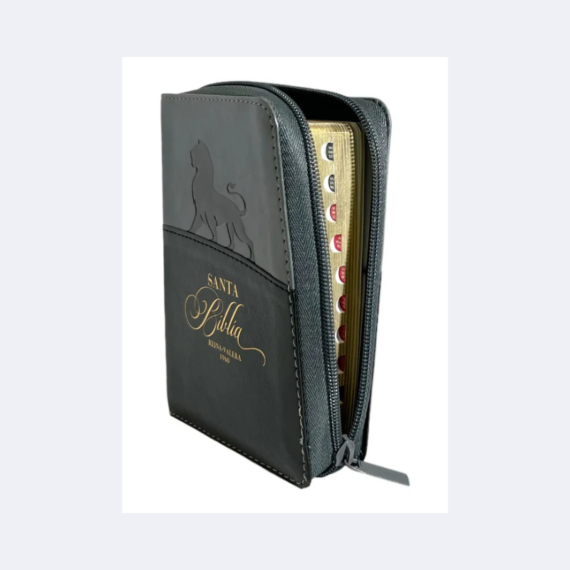 Reina Valera 1960, tamaño bolsillo , Imitación piel negro/gris con índice y cierre, palabras de Jesús en rojo. Concordancia amplia de palabras de la Biblia, concordancia personajes. 32 páginas a todo color con ayudas y esquemas. 12 mapas a todo color .Referencias cruzadas. Letra: 8,5 puntos.