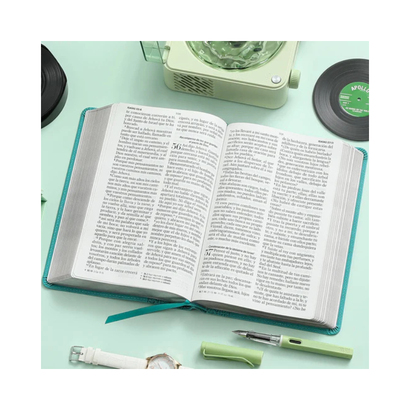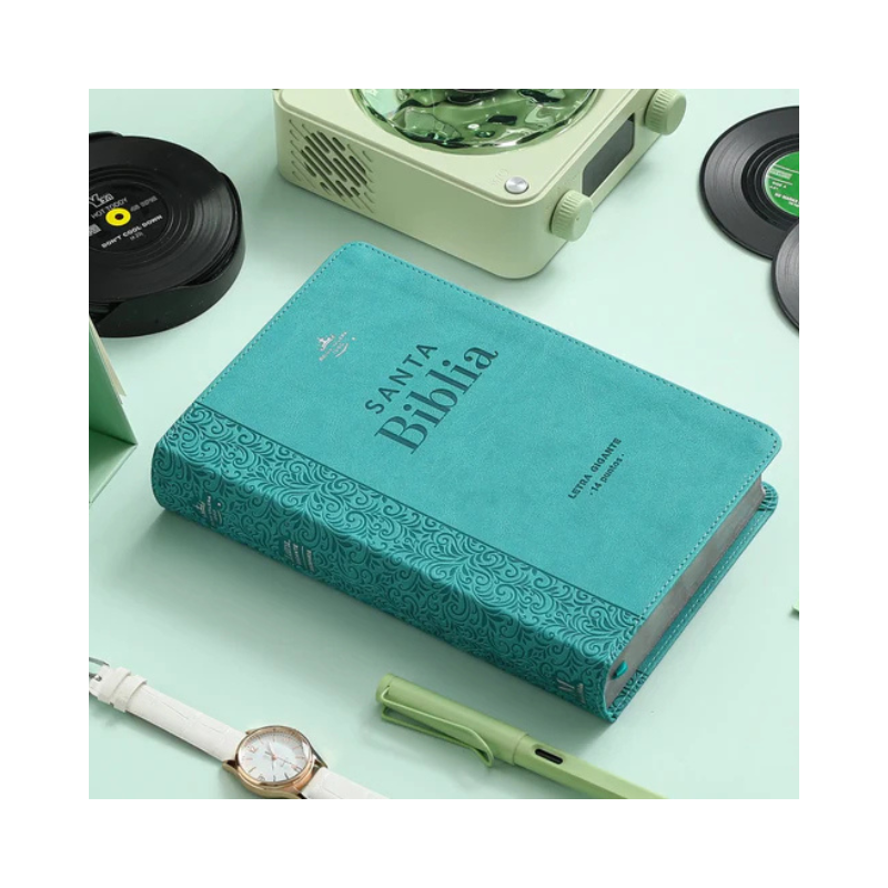 Reina Valera 1960, tamaño manual (14×21 cm), Letra gigante 14 puntos, i/piel, canto plateado, palabras de Jesús en rojo, concordancia , Concordancia de personajes bíblicos. ayudas, referencias cruzadas. 32 páginas a todo color con ayudas y esquemas. 12 mapas a todo color .Letra 14 puntos