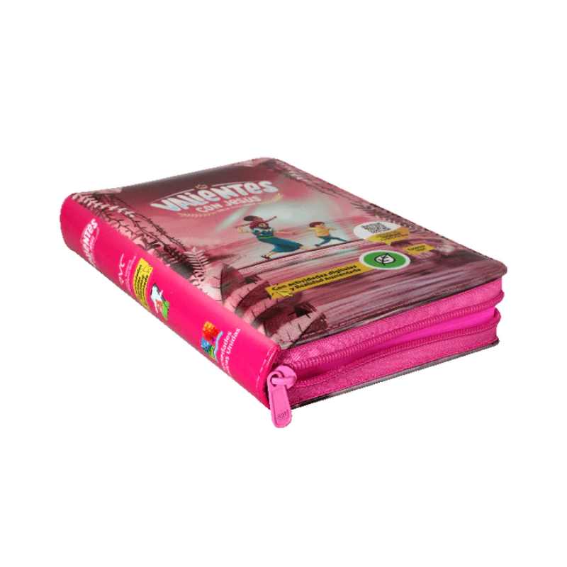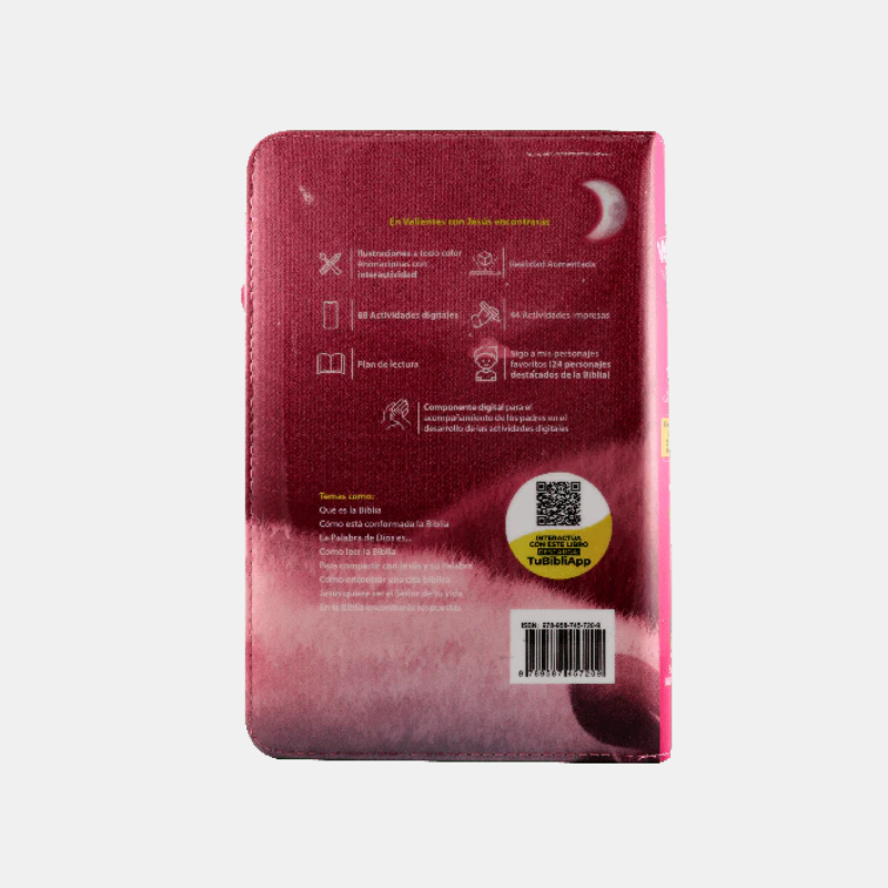 LA BIBLIA PARA TODOS Biblia ilustrada Valientes con Jesús con el texto de Reina Valera Contemporánea, es una Biblia que ha sido diseñada para niñas y niños de hoy, entre 7 a 12 años de edad. Nuestro anhelo es animarles a conocer a Jesús acercándoles a la Palabra de Dios, a través de un lenguaje sencillo y comprensible, ilustraciones, realidad aumentada y 132 actividades digitales e impresas, las cuales facilitarán la lectura y la comprensión de la Biblia, sea que la lean solos o con sus padres y maestros. Se llama Valientes con Jesús porque en la sociedad actual, literalmente es de valientes mantener los valores, mandatos y forma de vida que Jesús quiere que llevemos. Los niños diariamente están expuestos a modelos y tendencias contrarias a la Palabra, y si no tienen bases sólidas pueden sucumbir, y así alejarse del plan de Dios. Oramos al Señor para que los niños que reciban esta Biblia, sean animados en su amor por Dios y su Palabra produciendo en ellos una fe que les permita se Valientes con Jesús.Leer más